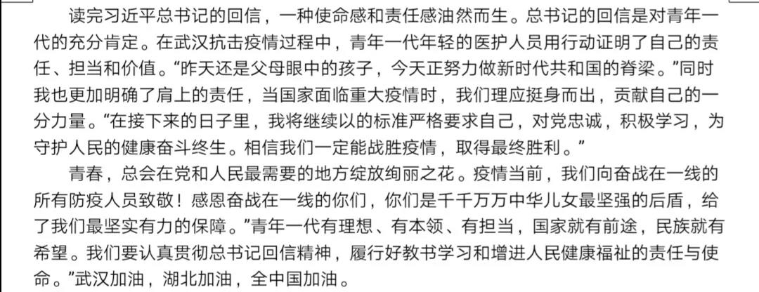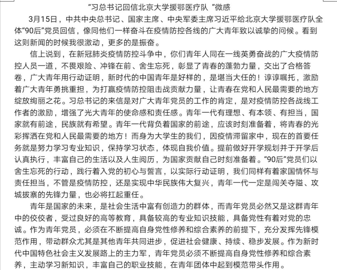 公海gh555000aa线路检测员工党员围绕“习近平总书记回信”心得体会 作者:李孟帆 来源:公海gh555000aa线路检测 发布时间:2020-07-07 阅读次数: 中共中央总书记、国家主席、中央军委主席习近平3月15日给北老员工援鄂医疗队全体“90后”党员回信,向他们和奋斗在疫情防控各条战线上的广大青年致以诚挚的问候。公司17级党员、预备党员,19级各班团支部积极响应号召,感受颇深,执笔写下内心的真实体会。 (审核人:相萌萌)