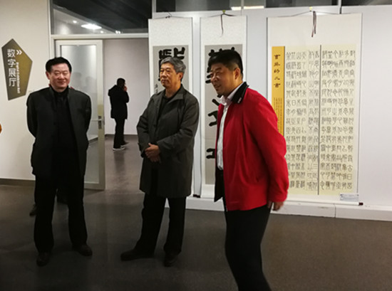 此次展演,同学们自行浏览展览馆的隶书,楷书,草书等诸多书法作品,参展作品凝聚了同学们的心血,风格迥异,或劲健或婉转,或如春风拂面繁华一片,或如北风入关深沉冷峻,让同学们叹为观止。浑厚激昂的朗诵,悠远声长的古筝奏弹,婉转凄清的二胡独奏以及听音作画的表演与书法作品相晖交映,浑然一体,精彩纷呈,展厅瞬间充满书香气息,展演曲目丰富,参与师生众多,旨在为参展者呈现一场难忘的书法展演文化盛宴。八米长的书法作画“君不见黄河之水天上来,奔流到海不复回”,李白的《将进酒》在笔者的手里绽放开来,笔势之劲,大开大合,如龙蛇游走,在纸上飞舞,让同学们眼前一亮,得到大家的频频称赞。11月13日展演下午,吉林建筑大学书法公司党总支书记吕欣及专业教师在公司书法系主任张函,聊城市书法家协会主席方建光的陪同下前来参观,吕书记对同学们的展览作品表示赞叹,并对聊大学子们展现的书法风采和素养给予肯定,同学们收获良多,受益匪浅。