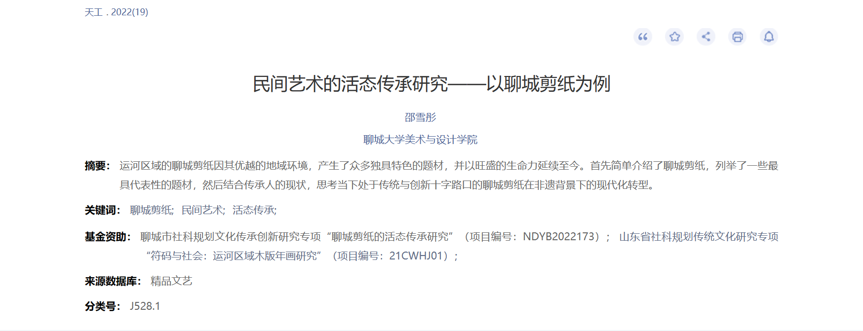 2022年7月论文《民间艺术的活态传承研究——以聊城剪纸为例》发表于《天工》;