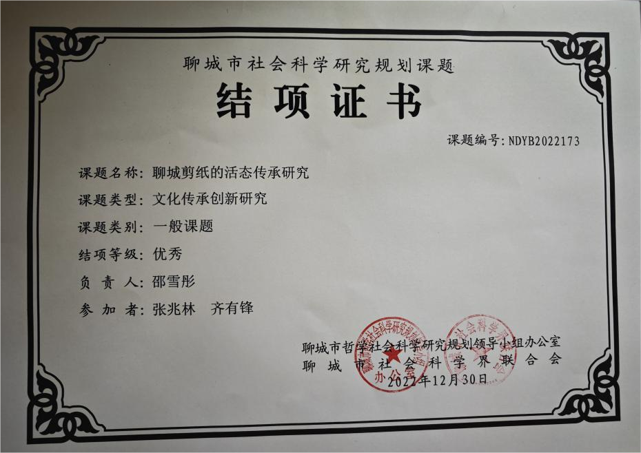 2022年12月课题《聊城剪纸的活态传承研究》荣获“2022年度聊城市哲学社会科学规划课题优秀结项”;