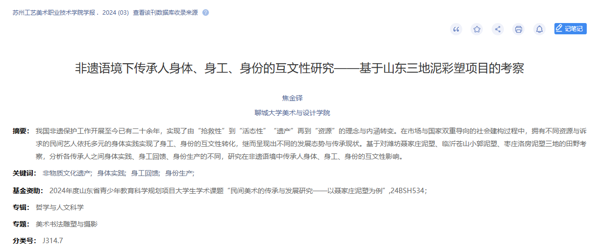 2024年8月论文《非遗语境下传承人身体、身工、身份的互文性研究——基于山东三地泥彩塑项目的考察》发表于《苏州工艺美术职业技术公司学报》;