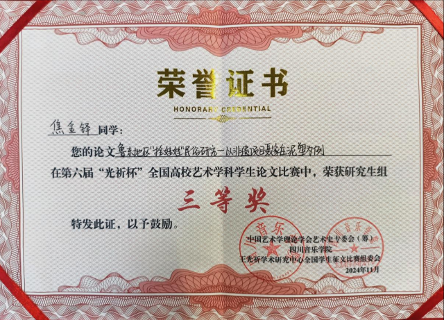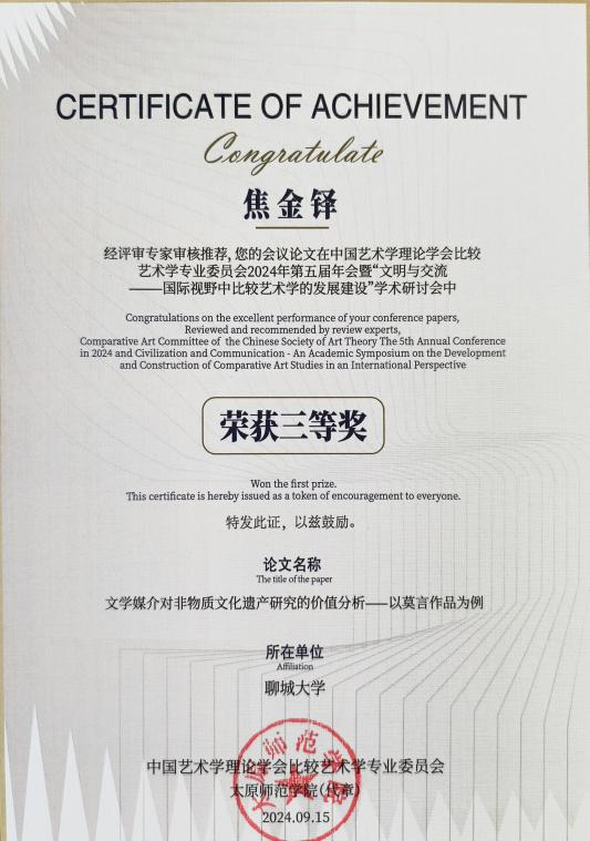 2024年9月论文《文学媒介对非物质文化遗产研究的价值分析——以莫言作品为例》荣获“文明与交流”学术研讨会暨2024中国艺术学理论学会比较艺术学专业委员会第五届年会论文组三等奖;