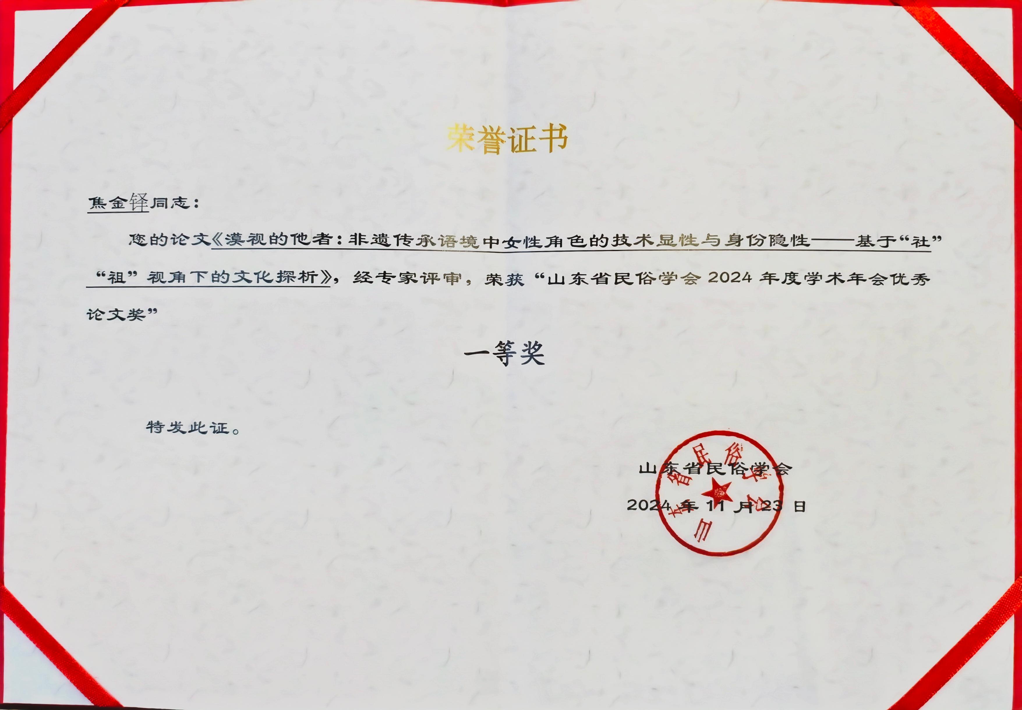 2024年11月论文《漠视的他者:非遗传承语境中女性角色的技术显性与身份隐性——基于“社”“祖”视角下的文化探析》荣获“非物质文化遗产与新时代社会发展”学术研讨会暨山东省民俗学会2024年学术年会论文一等奖;