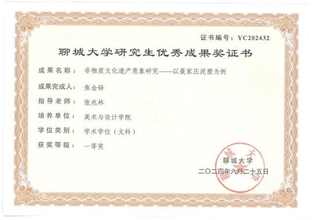 2024年11月论文《鲁东地区“拴娃娃”民俗研究——以高密聂家庄“泥娃娃”为例》荣获第六届“光祈杯”全国高校艺术学科员工论文比赛研究生组三等奖;