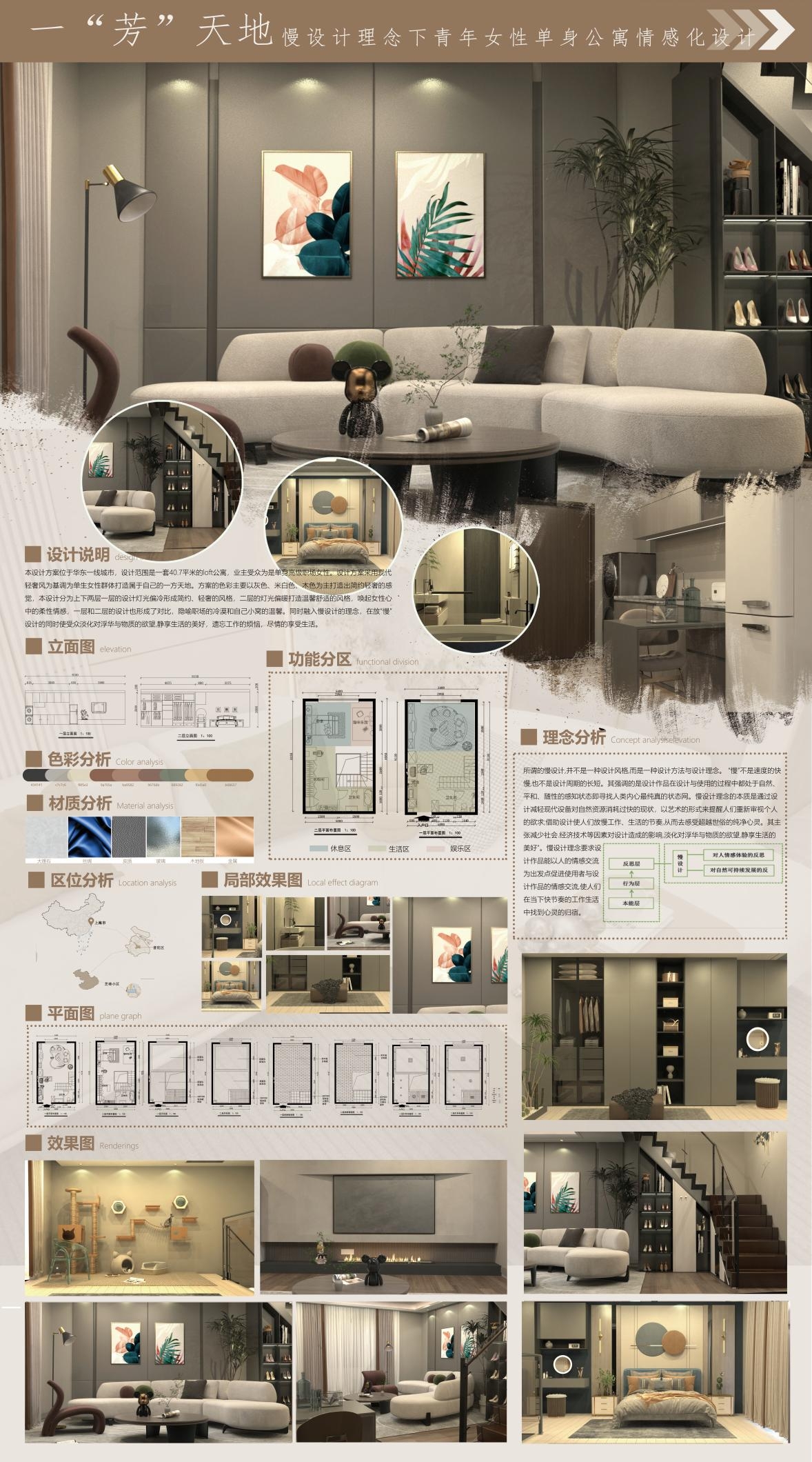 2023年11月作品《一“芳”天地——慢设计理念下青年女性单身公寓情感化设计》荣获第九届“中装杯”全国老员工环境设计大赛二等奖;