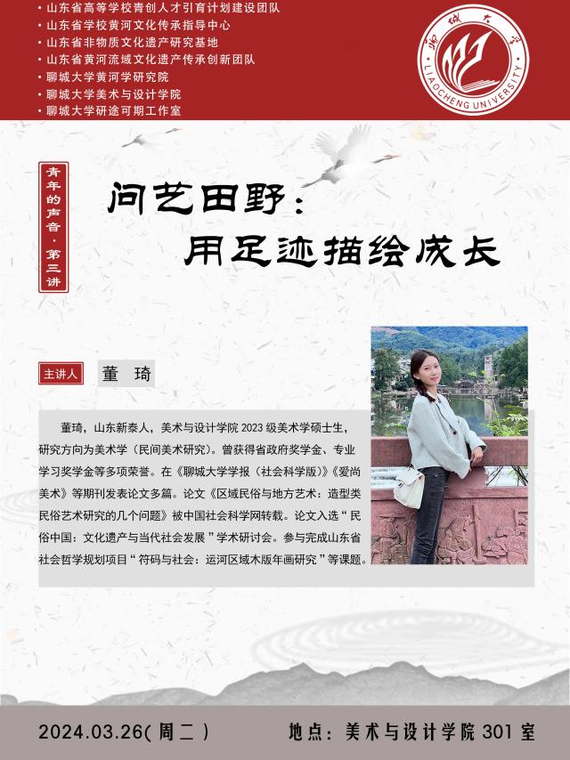 3月26日,2023级研究生董琦为2022级部分本科生作题为《问艺田野:用足迹描绘成长》的学术分享。董琦以自身的田野考察经历出发,讲述其从研究生入学前到入学后的田野考察经历,再以皮影戏为个案,描述皮影戏在文化变迁的视角下艺术功能的嬗变。最后,董琦认为在学习中文献阅读固然重要,但田野考察也是必不可少,唯有开展充分的田野考察才能有利于实现从现实问题思考到理论成果的转化。