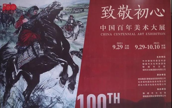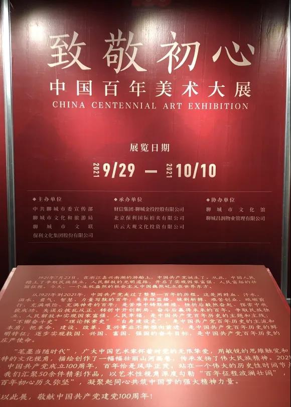 2021年9月29日至2021年10月10日,由中共聊城市委宣传部、聊城市文化和旅游局、聊城市文联和保利文化集团股份有限公司主办的“百年征程波澜壮阔 百年初心历久弥坚 致敬初心—中国百年美术大展”于聊城文化活动中心举办。