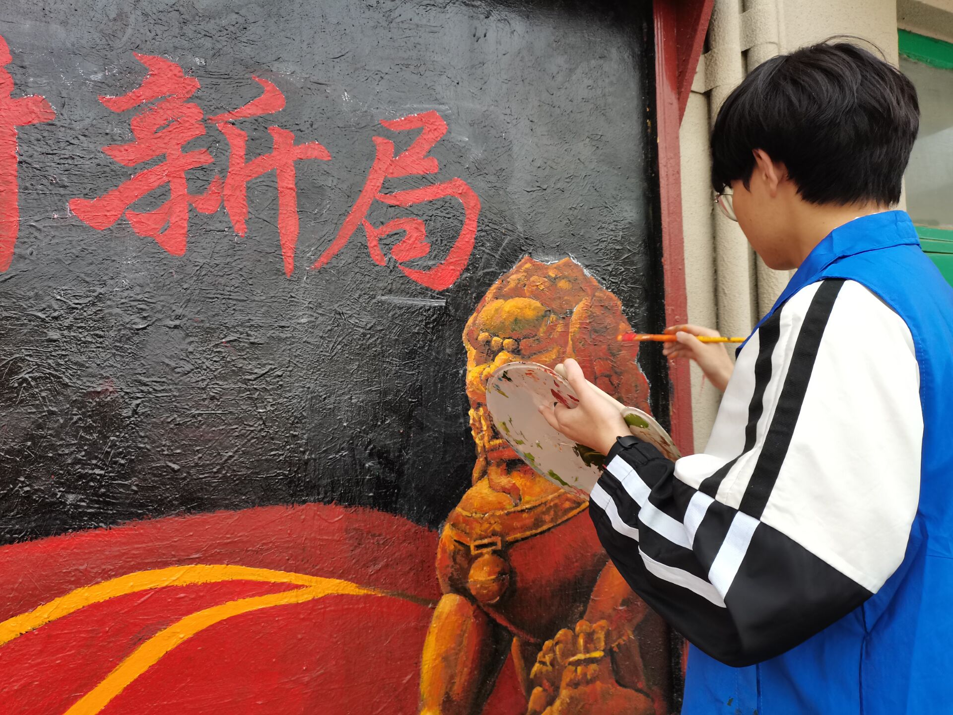 志愿者细心地准备好绘制板报所需的各种材料,经过明确的分工后开始有条不紊地进行板报绘制。冷风寒气逼人,但志愿者们心中饱满的热情以及对这份意义非凡的任务充满热爱、一丝不苟的态度丝毫没有被周围环境所影响。通过比对事先设计好的模板,志愿者们全神贯注地对图案与细节进行刻画,中途有意见不统一或者突兀的小细节,都会经过志愿者们慎重的讨论之后得到合理的改善。志愿者们充分发挥团队精神,集思广益,合理布局,运用艺术字对黑板报进行精心的设计,“学党史、悟思想、办实事、开新局”的主题呈现在大家面前,威风凛凛的雄狮屹立在画面中,生动的画面不断地吸引行人驻足观看。