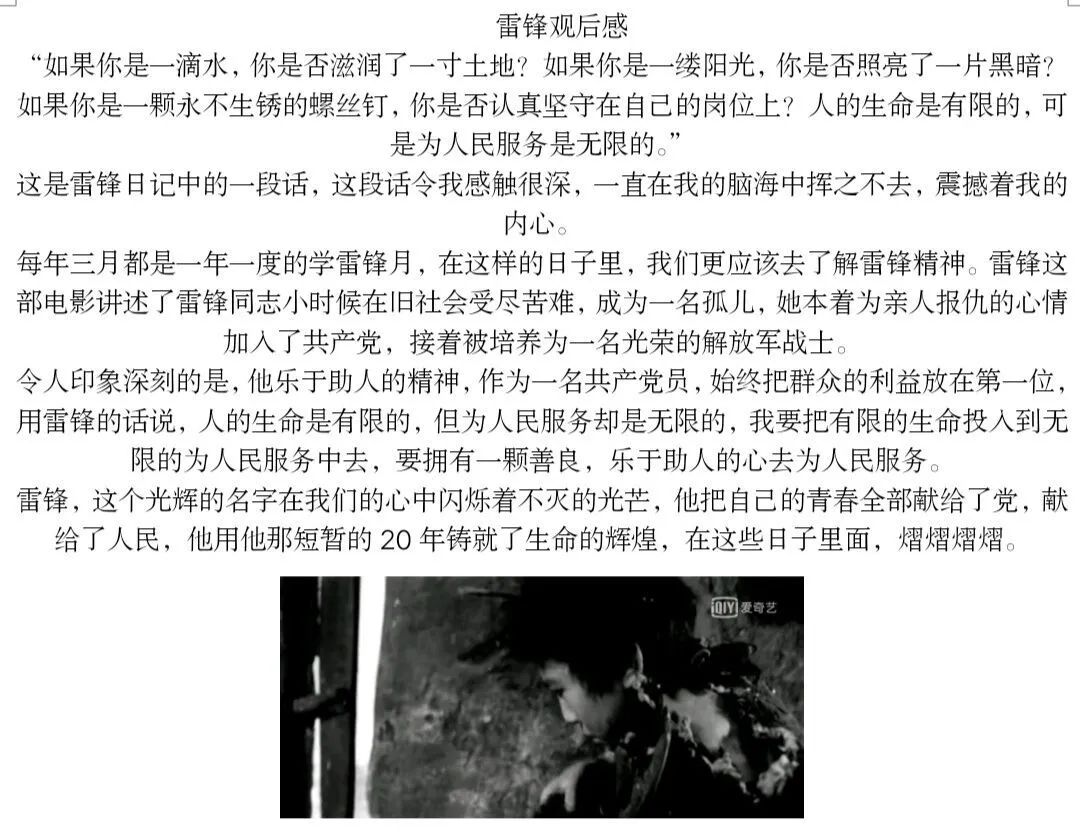 斯人已去犹忆影,海棠花开魂依旧。活动开始后,同学们在网上自行观看有关弘扬雷锋精神的影视作品,并截取观看截图。观看影片作品之后,同学们根据影片内容写一篇观后感。简单的活动流程,但其中蕴含的意义颇丰。在同学们提交的作品背后,展现到了同学们的用心和真挚感情。雷锋同志与世长辞,但雷锋的精神没有就此离去,它一直存在我们的在生活中,笼罩在中华大地。此次活动,志愿者分工明确,活动有序进行。