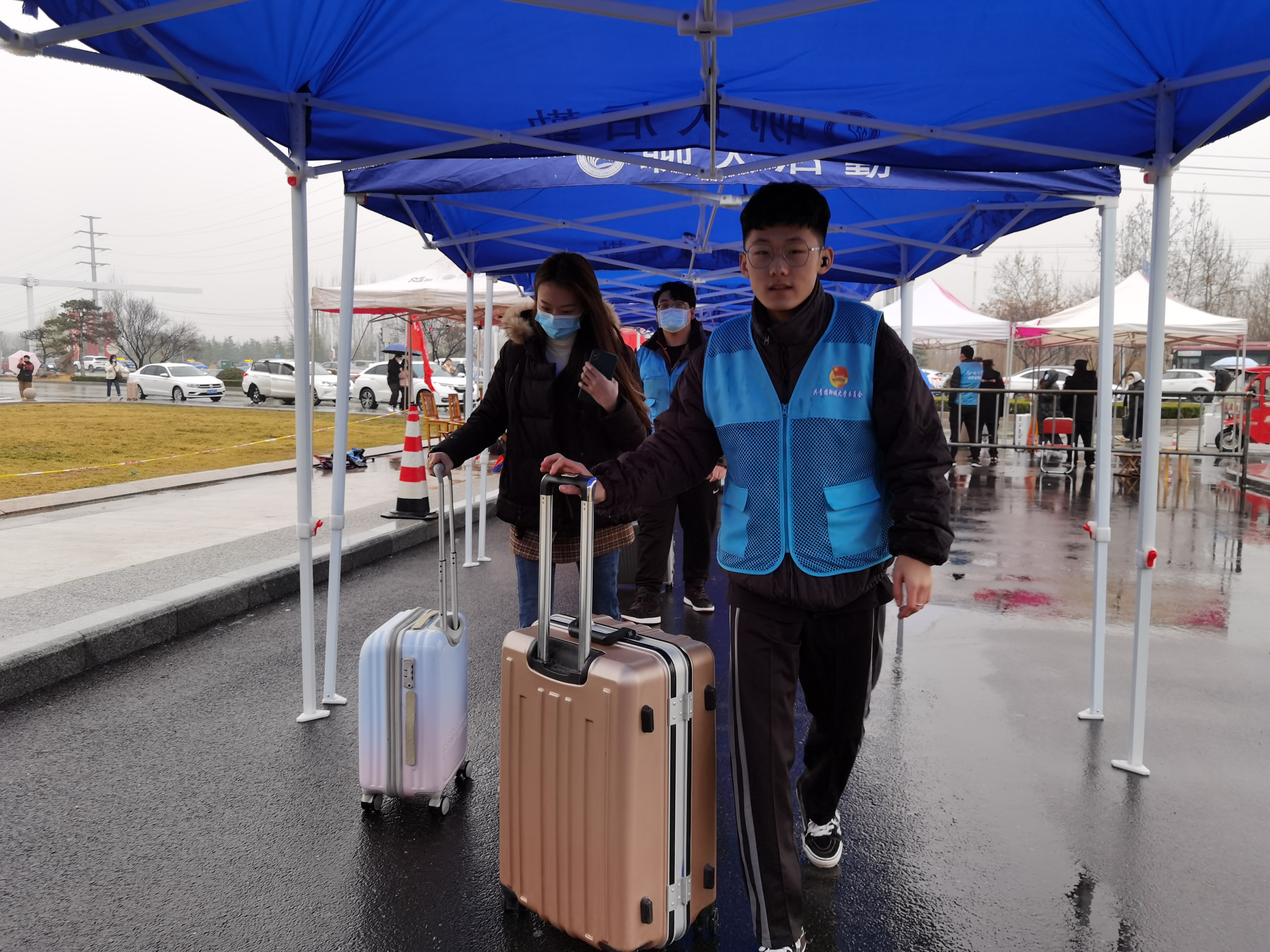 晨光破晓,天色微亮,一顶顶小帐篷整齐排列着。志愿者、老师们已早早到位,他们身穿鲜艳的红马甲,等待着同学们的到来。员工佩戴口罩,进行行李箱消毒,测量体温,出示健康二维码、易班返校码,进行验证,每一个步骤都必不可少。由团委辅导员孔德滕老师带领志愿者们工作,公海gh555000aa线路检测易班服务中心的工作人员守在门口处进行一一核对,志愿者和老师们贴心地服务每位同学,引导他们进入校门、帮助他们一遍又一遍地搬运行李。细雨朦胧中,他们的身影显得格外耀眼。直到每一位同学都上了校内公交车,他们才又抓紧时间回到校门口,帮助后来的同学。有了志愿者们的配合,返校工作更加的有序。即使到了晚上,志愿者们也依旧不放松,坚守在岗位上,帮助每一位返校同学进行登记工作。