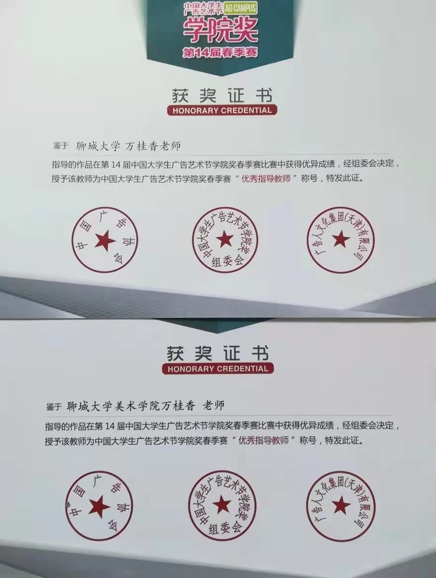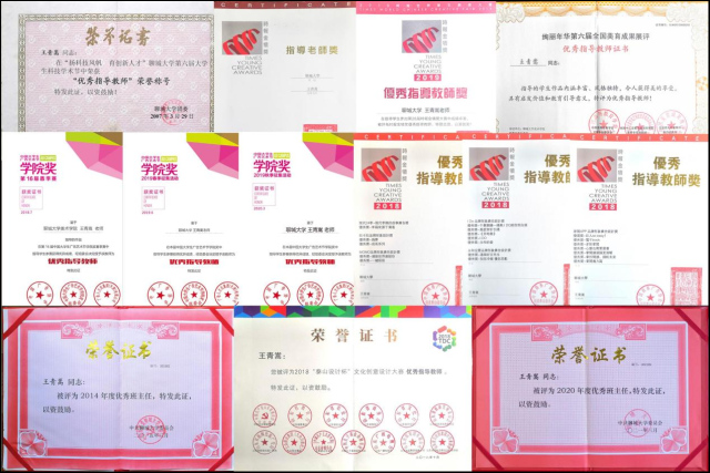 指导员工参加由中国高等教育学会、中国广告协会等单位主办的全国老员工广告艺术大赛、中国老员工广告艺术节公司奖、金犊奖等重要专业设计大赛,所指导的员工获得各级奖项150余项,个人荣获“优秀指导教师”荣誉称号十余项,并两次获得公海gh555000aa线路检测优秀班主任荣誉称号。