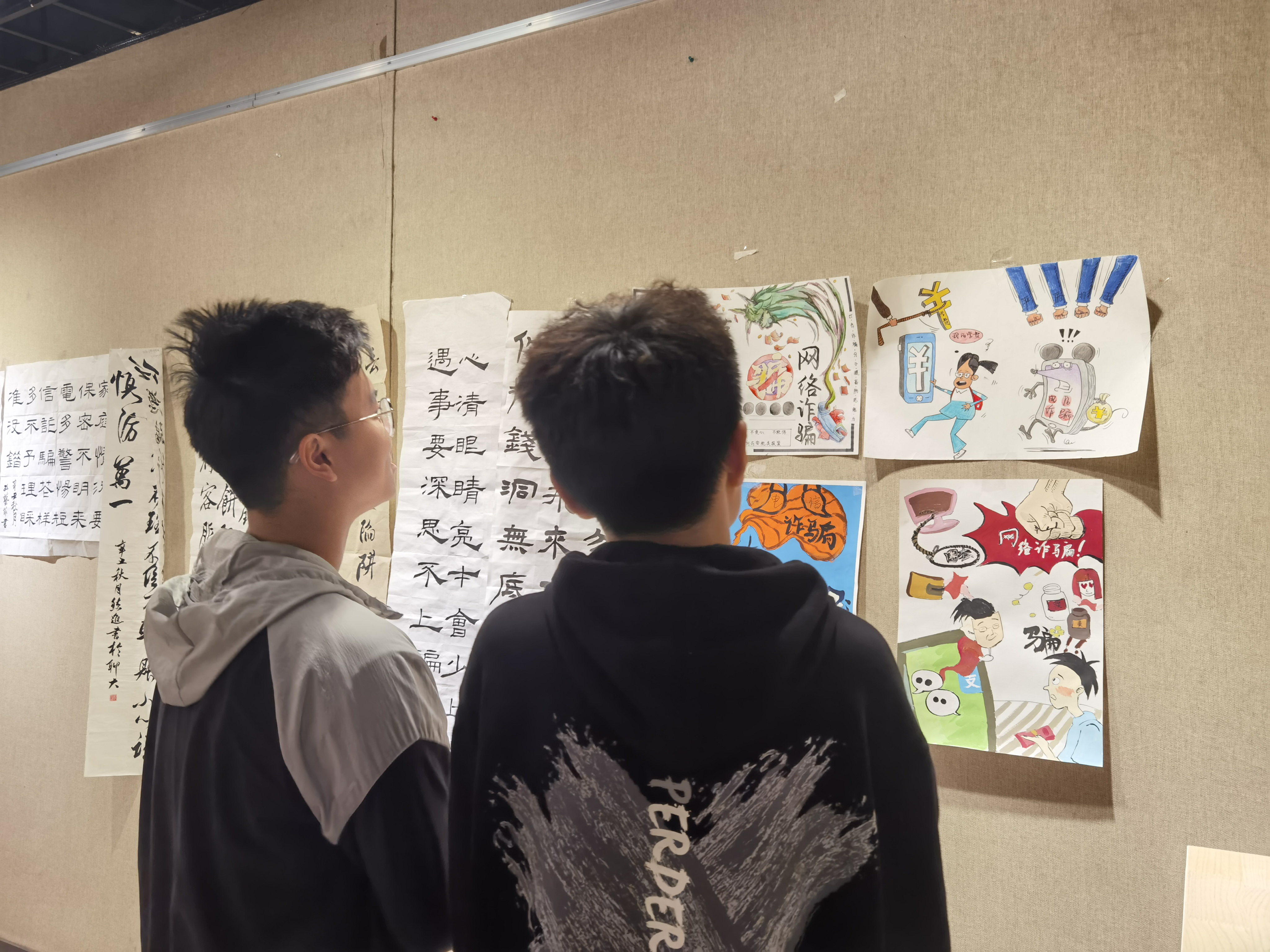 本次活动通过线下的方式展开。组织人员在活动前期对同学们进行书画征集,同学们都积极发挥自己的艺术才能,展开自己的想象,希望借自己的作品来提醒同学们不要轻信网络谣言,保护好个人财产安全。而在场的同学们都认真欣赏着参赛同学们的优秀作品,并且赞叹连连,一个个陈列在位的书画作品仿佛也在坚守着自己的使命,告诫人们不要相信网络上的虚假信息。即使活动结束后,同学们也在互相讨论着如何让更多的人去了解和避免受到诈骗。