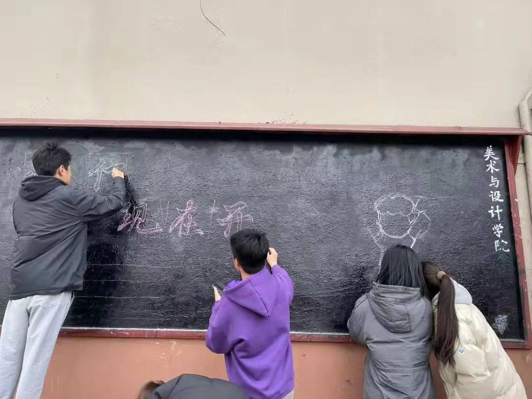 在正式开始绘制之前,各位志愿者将所需的材料准备齐全,认真的商讨本次黑板报所要用的素材与排版,并且分配好了各自的任务。画笔在手中轻轻挥动,图文在黑板上渐渐浮现,志愿者们充分发挥自己的专业特长,有条不紊的进行着绘制。冬季的寒风凌冽地吹在着志愿者们的脸上,但他们饱含的热情以及一丝不苟的态度却丝毫没有被周围环境所影响。时间流逝,不知不觉中,黑板便已被填满,板报的绘制顺利完成。潇洒的行楷字体、高级的颜色搭配和简明的排版设计都凝聚着志愿者的汗水和智慧。“诚信考试,现在开始”几个大字遒劲有力,绘制的插画也十分切合主题,许多路过的老师和同学被吸引,纷纷驻足欣赏。绘制结束后,志愿者们整理好工具,清理了现场残留的颜料和其他垃圾,并合影留念。