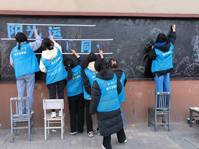 正式开始绘制之前,志愿者们提前准备好所需要的喷漆、颜料、画笔等工具,以确保活动的正常进行。到达绘制地点后,志愿者们明确分工,通力合作,把事先设计好的模板用粉笔在黑板上起好稿,而后拿起画笔有条不紊的进行绘制。随着画笔的不断摆动,一条条线条由淡转浓,逐渐在黑板上勾勒出板报的内容。在志愿者们欢声笑语的绘画过程中,黑板慢慢的被填满,一幅美丽的健康运动板报展现在大家眼前,吸引了许多路人的驻足观赏。绘制结束后,志愿者们清理了余下的垃圾,保持场地的整洁性和活动的有序性,为本次活动画上了圆满的句号。