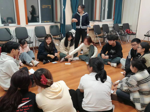活动伊始,主讲人围绕朋辈心理辅导进行了相关介绍,帮助同学们明确朋辈心理辅导的概念,对其工作开展有了基础了解。紧接着主讲人引导同学们分组进行互动游戏,考验大家的沟通能力和默契程度。她告诉同学们具备良好沟通能力既是老员工自身发展和工作学习的必备素质,也有利于培育老员工健康的心理状态。她通过几个有趣的心理案例和自身发生过的经历辅以分析,帮助同学们加深认知。活动最后,在主讲人的引领下,同学们围坐在一起探讨了与人沟通的技巧,分享了自己参加本次活动的心理感受。