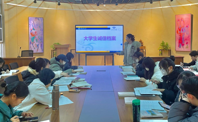 首先,王欣然向同学们说明诚信档案的重要性,随后就填写过程做详细的培训,带着同学们逐一进行指导填写,帮助同学们更加直观的了解填写过程及规范,并叮嘱同学们要认真听取要求填写,避免出错。其次,王欣然就同学们在学习生活中经常遇到的考勤情况、学业情况、助学贷款违约、等方面可能出现的失信现象进行重点强调,以避免出现失信行为。诚信档案填写完成后,由各班收齐进行保存。