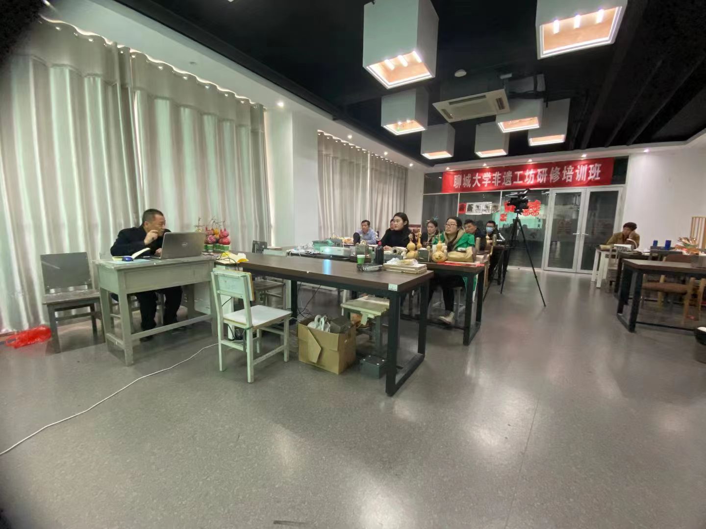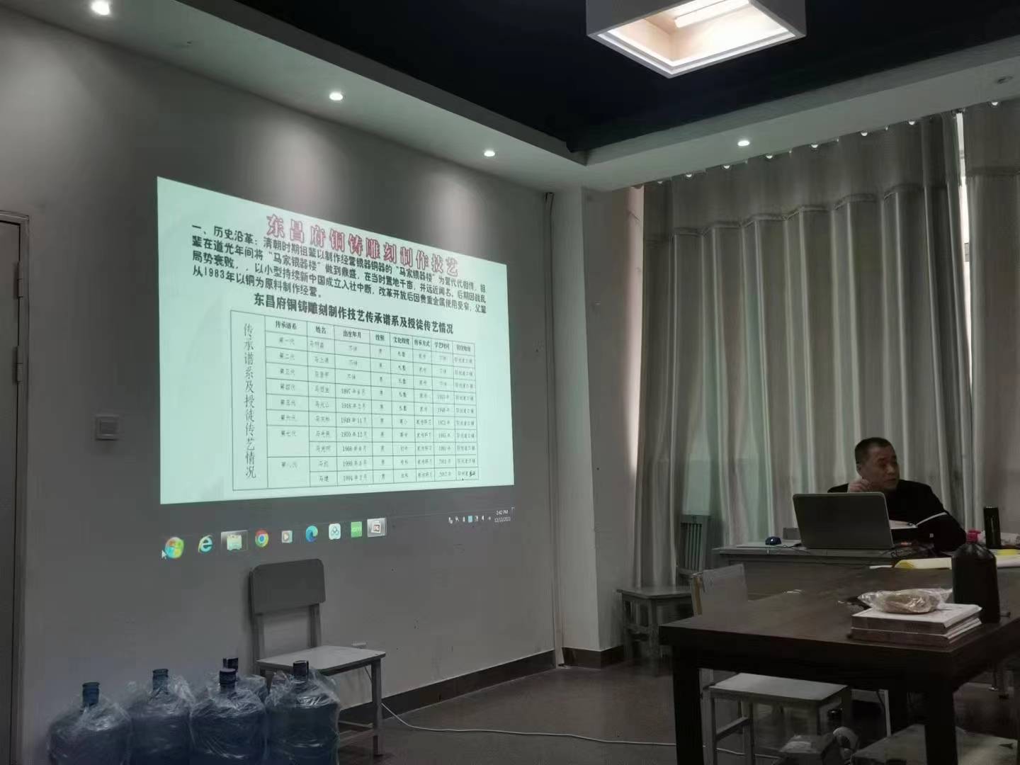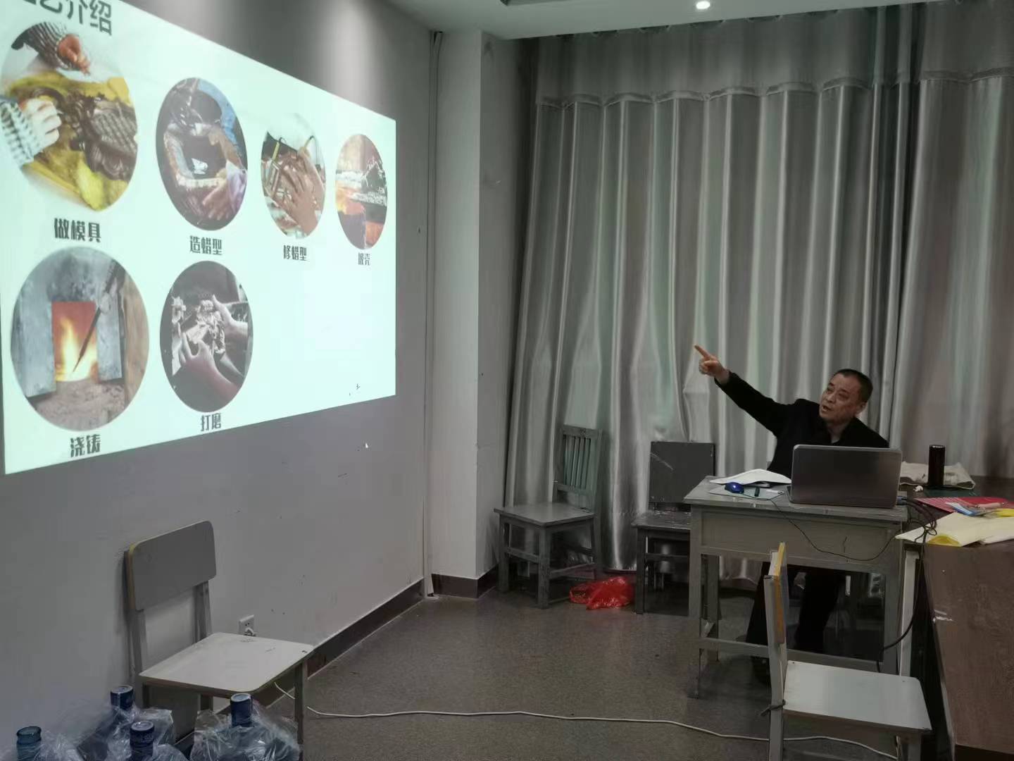 12月13日下午,东昌铜铸雕刻技艺省级非遗传承人马先明老师来到公海gh555000aa线路检测空中美术馆,给公海gh555000aa线路检测非遗工坊带头人研培班开展讲座。
