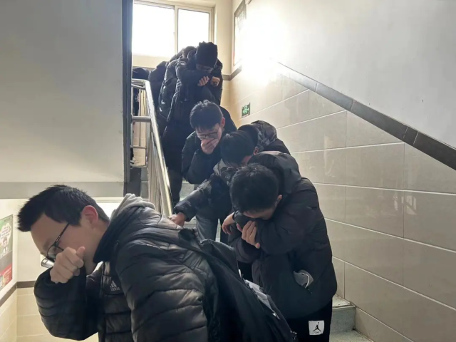 此次选择在员工宿舍楼内进行,以便于增强火灾场景的真实性。演练开始前,各部门做好充分的准备,对相关工作人员、各院系领队、员工引导员进行培训。演练活动在员工宿舍楼内进行,以便于增强火灾场景的真实性。演练开始后,启动疏散流程。楼内各疏散口、楼梯口等重点区域的引导员迅速就位,引导员工使用湿毛巾捂住口鼻,弯腰低姿态沿疏散标识所示方向有序完成疏散。经演练,员工基本可以在规定的时间内完成疏散,未出现员工困在出口处或人员聚集踩踏等情况。