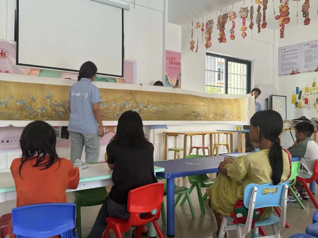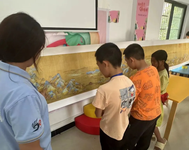 志愿者对中国传世名画《千里江山图》进行讲解,这幅由北宋王希孟创作的绢本设色画,以其恢弘的气势、细腻的笔触和绚丽的色彩,展现了中国古代山水画的巅峰之美。通过志愿者绘声绘色的讲解,使社区居民深深的体会到了中国画的魅力。志愿者讲解结束后,社区居民纷纷近距离观看《千里江山图》,在这丹青画卷之中,将开启一段穿越时空的文化之旅,汲取智慧与力量,让古老的艺术在年轻的心灵中绽放新的光彩。