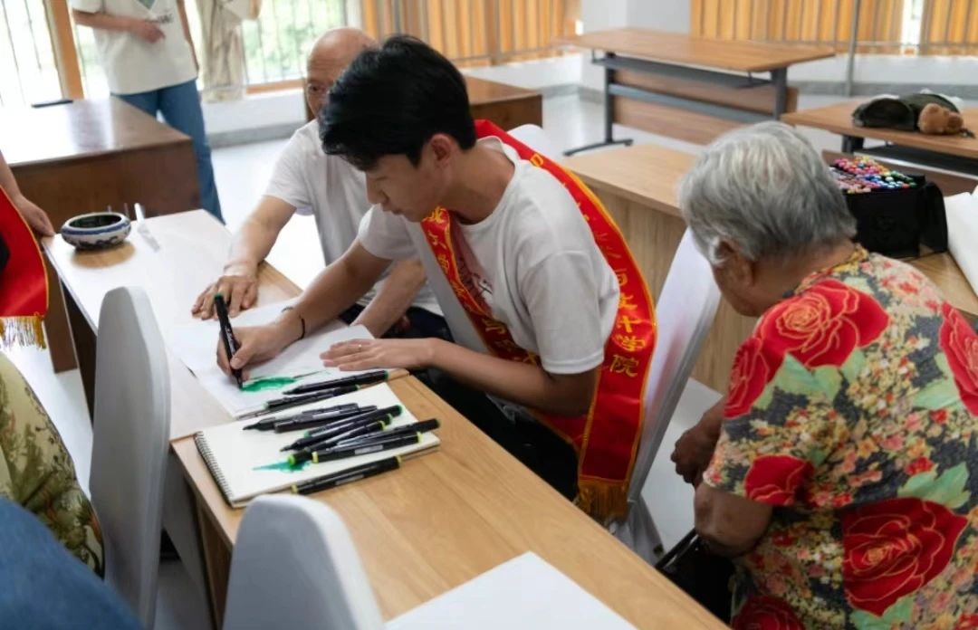 为了弘扬敬老爱老的中华优秀传统美德,增强青年人的社会责任感和奉献精神,8月21日公海gh555000aa线路检测“天翼”志愿服务队前往颐和养老敬老院开展了“牵手爱老”社会实践活动。在负责人组织统筹下志愿者与老人们打招呼问候,并且展示了自己的书法和绘画作品,讲述了作品的一个个小故事,随后参与的志愿者们邀请老人们一起以书法,绘画的形式在纸上留下对未来美好生活的祝愿。活动现场时不时爆发出欢声笑语,大家在潜心创作的同时,还不忘交流心得,分享经验。有老人分享道,这不仅仅是在进行书法绘画,更是在用作品表达内心的情感。活动进入尾声,志愿者和老人进行合影留念,在不舍的告别声中此次活动完美的结束。