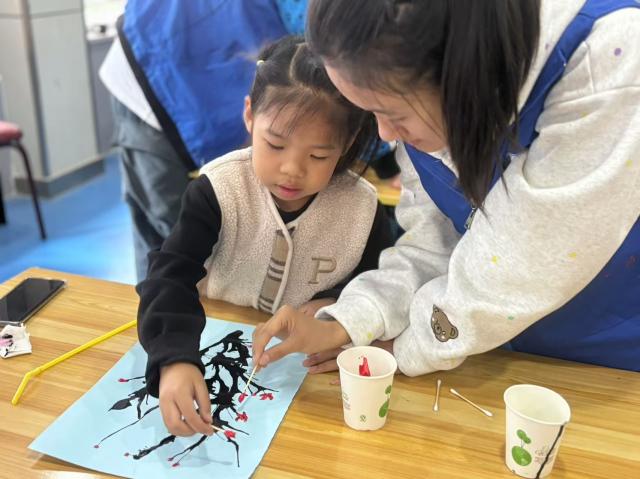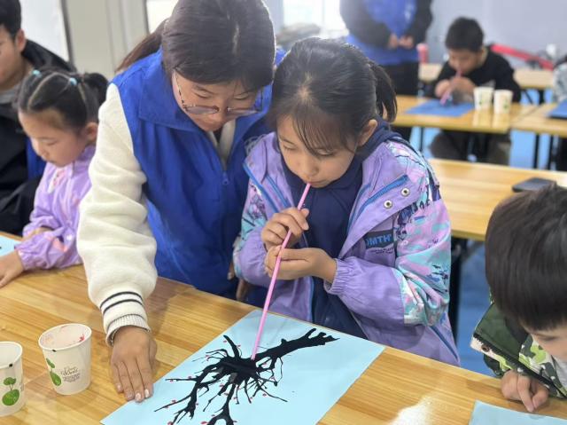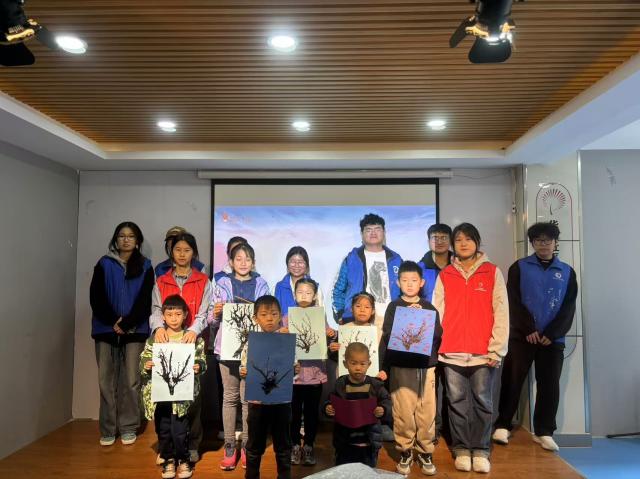 活动伊始,志愿者通过ppt进行讲解,带领孩子们了解这次此次活动所绘的作品,孩子们认真的倾听志愿者的讲解,并向志愿者表达他们自己的想法,志愿者与孩子们对制作进行了积极的讨论,提高了孩子们的制作乐趣。随后,进入手工阶段,志愿者们分发活动材料,并讲解制作方式,孩子们用吸管、卡纸、颜料等物品,发挥自己的想象通过吸管吹墨水的方法制作各种大树的形状,伴随着孩子们不断的吹气,墨水在纸上朝着不同方向前进,树枝的形状渐渐地显现。最后孩子们用棉签沾取红色颜料,点上梅的形状,在志愿者们的帮助下作品很快制作完成。属于孩子们自己的梅花作品生动形象,创意十足。活动最后,志愿者和孩子们举着制作的梅花作品合影留念,为今天的活动画上圆满的句号。