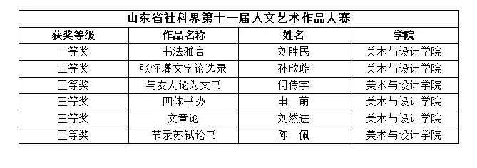 近日,由山东省社会科学界联合会、山东省文学艺术界联合会主办,省社会科学发展交流中心、省美协、省书协、省摄协承办的“山东省社科界第十一届人文艺术作品大赛”获奖名单公布。公司刘胜民副教授获一等奖,硕士研究生孙欣璇获二等奖,硕士研究生何传宇、申萌、陈佩,本科生刘然进获三等奖。