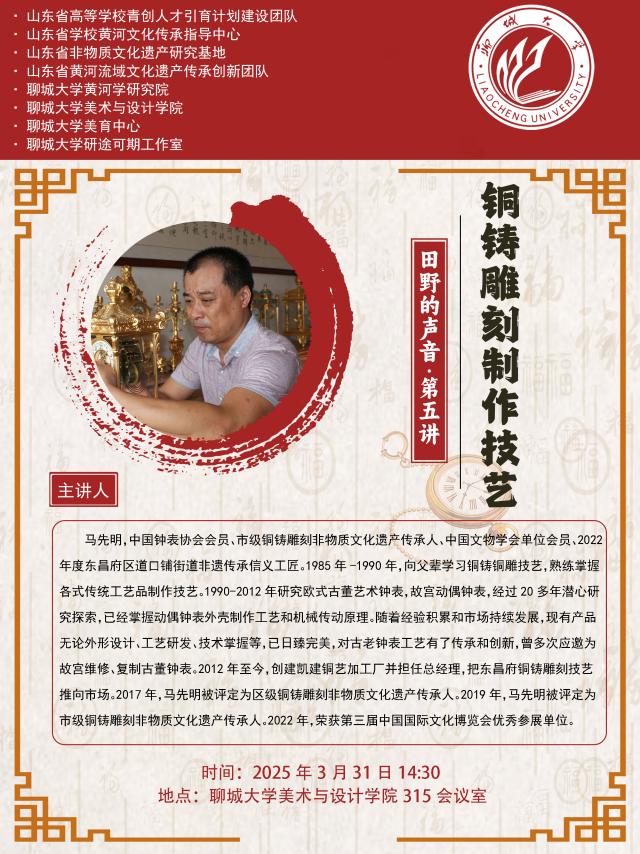 3月31日,中国钟表协会会员、中国文物学会单位会员、市级铜铸雕刻非物质文化遗产传承人马先明应邀为公司师生作题为《铜铸雕刻制作技艺》的讲座。