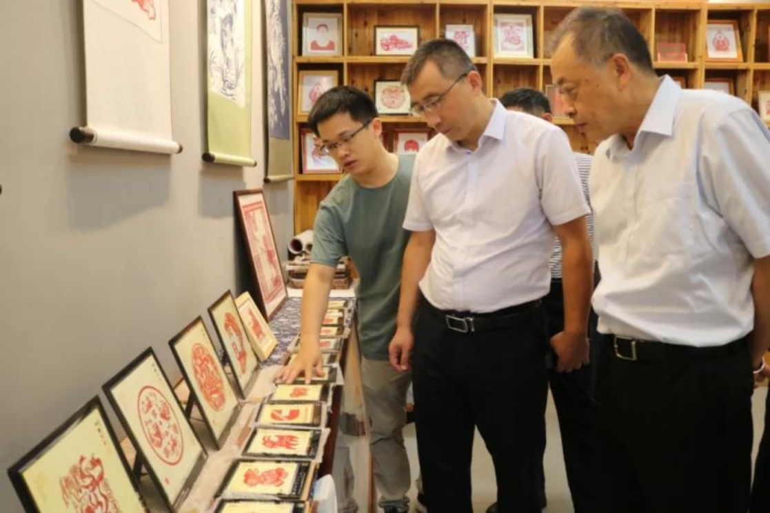 ▲剪纸项目传承人李占恒向蒋士秋副处长和张康调研员介绍剪纸文化