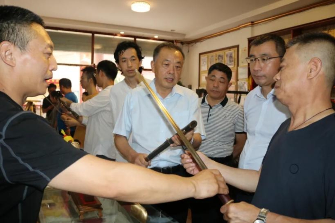 ▲董氏古兵器项目传承人董现行向大运河沿线调研组一行介绍古兵器文化