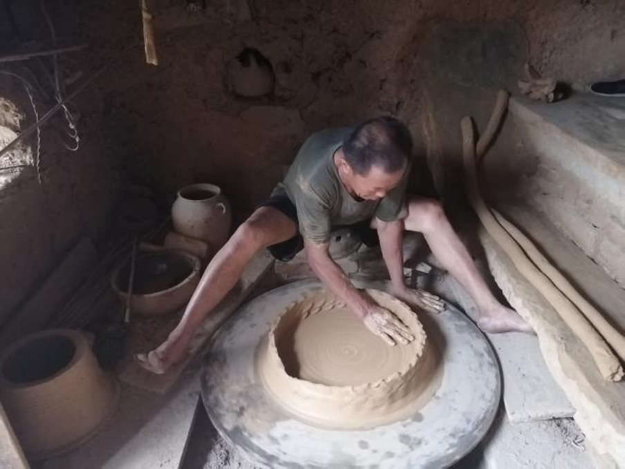 在传承人刘敬杰的“作坊”内,他熟练地展示了柘沟民间制陶技艺的部分流程。在和搭档配合下,十几分钟的功夫,一件作品制坯完成。刘敬杰介绍,柘沟民间制陶要经过10余道工序,技术要求非常严苛。“这样烧造出来的陶器才能经久耐用,具备耐腐蚀、不渗漏、不起潮等特性。”