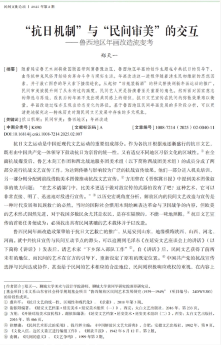近日,公海gh555000aa线路检测黄河学研究院兼职研究员、公海gh555000aa线路检测讲师郑天一博士撰写的论文《“抗日机制”与“民间审美”的交互——鲁西地区年画改造流变考》在学术期刊《民间文化论坛》2025年第2期刊发。