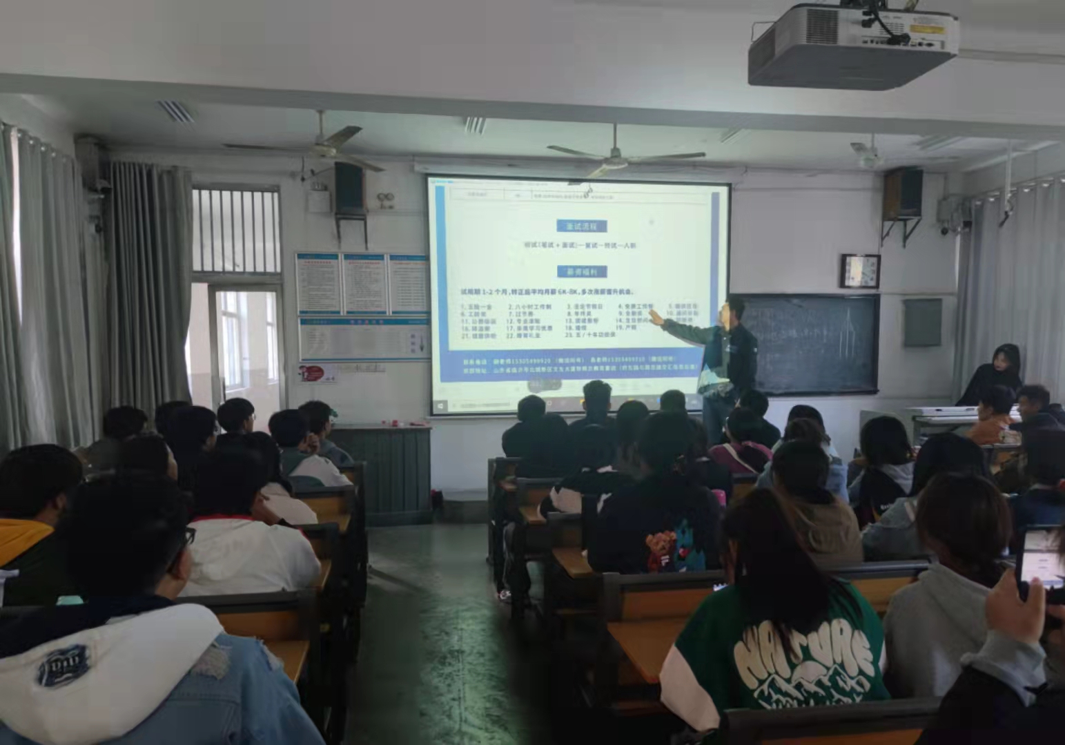首先,临沂新概念教育集团总经理助理展示了招聘会PPT,让同学们有了大概的了解,接着该集团总经理通过自身经验、视频等向同学们分析了当前老员工就业的相关形式和所需要注意的事情,并详细的介绍该集团概况、优势等。紧接着,总经理通过“集团简介”、“招聘需求”、“面试流程”、“薪资福利”四个方面层层递进的讲述了该企业招聘简章,为同学们在未来的求职路上更加明确了方向,了解了更多就业知识。最后,本次招聘会圆满结束。