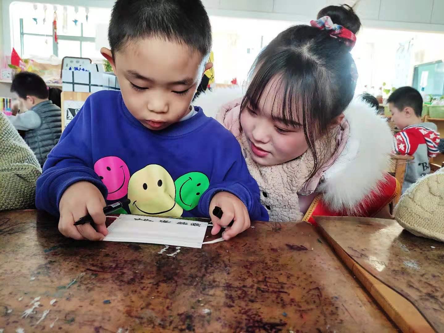 志愿者们提前准备好口罩以及马克笔,到达指定班级后和小朋友们围圈坐,进行自我介绍环节并向小朋友们讲解此次的口罩创意绘画活动,随后拿出提前准备好的工具,和小朋友一起挑选图案并绘画,绘画过程中,小朋友们围绕此次抗击新冠肺炎疫情的主题展开联想,发挥自己的想象力,一个个“中国加油”“消灭病毒”体现出小朋友们对抗击疫情必胜的信心,拿起自己的画笔作为武器,宣传防护、激励斗志,在分享美好得同时增强自身的防控意识,在这场战疫中贡献自己力所能及的力量。