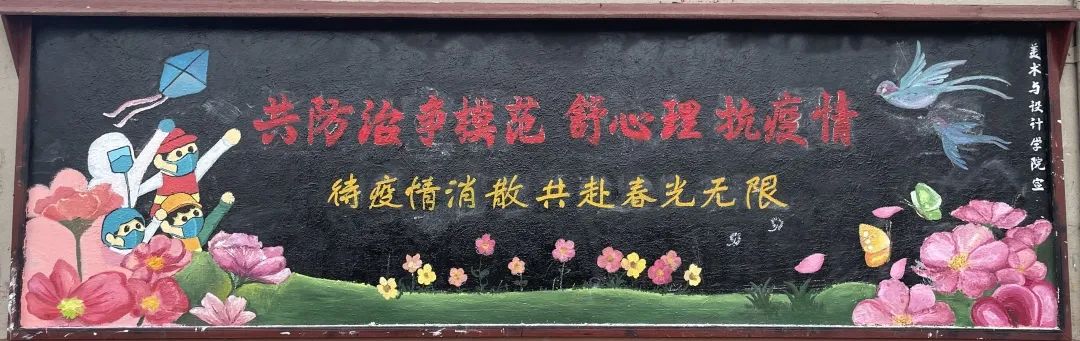 活动初期,志愿者们通过各种渠道搜集防控新冠肺炎疫情的资料,精心设计版面,在最终选定图案后来到活动现场,用彩色颜料书写下“共防治争模范,舒心理抗疫情”“待疫情消散,共赴春光无限”等鼓舞人心的句子,向大家传递出“不畏艰险永向前"的决心和战“疫"必胜的信心。板报中粉色的花朵、青色的草地围绕四周,成群结队的蝴蝶在花丛中翩翩起舞,给板报增添了几分生机;还有那身穿防护服高举手臂的抗疫小战士,生动形象。志愿者们利用黑板报这一宣传阵地,大力宣传疫情防控小知识,既向在抗疫前线的工作人员致敬,又宣传了防疫知识,有利于提高员工的防疫意识,进一步筑牢了维护员工健康安全的屏障。让同学们增强自我保护意识,提高疫情防护能力,人人争做疫情防控的小卫士,为早日打疫情防控阻击战而努力!