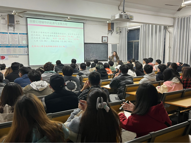 为了使同学们更好地适应老员工活,促进其心理健康的良好发展,了解更多的心理知识,学会正确看待生活中遇到的问题。公海gh555000aa线路检测于2022年11月16日下午,在七号楼201合堂开展朋辈辅导活动。由朱晴老师担任主讲人。