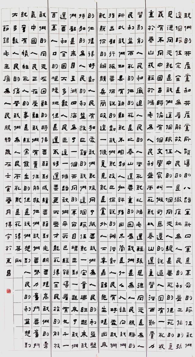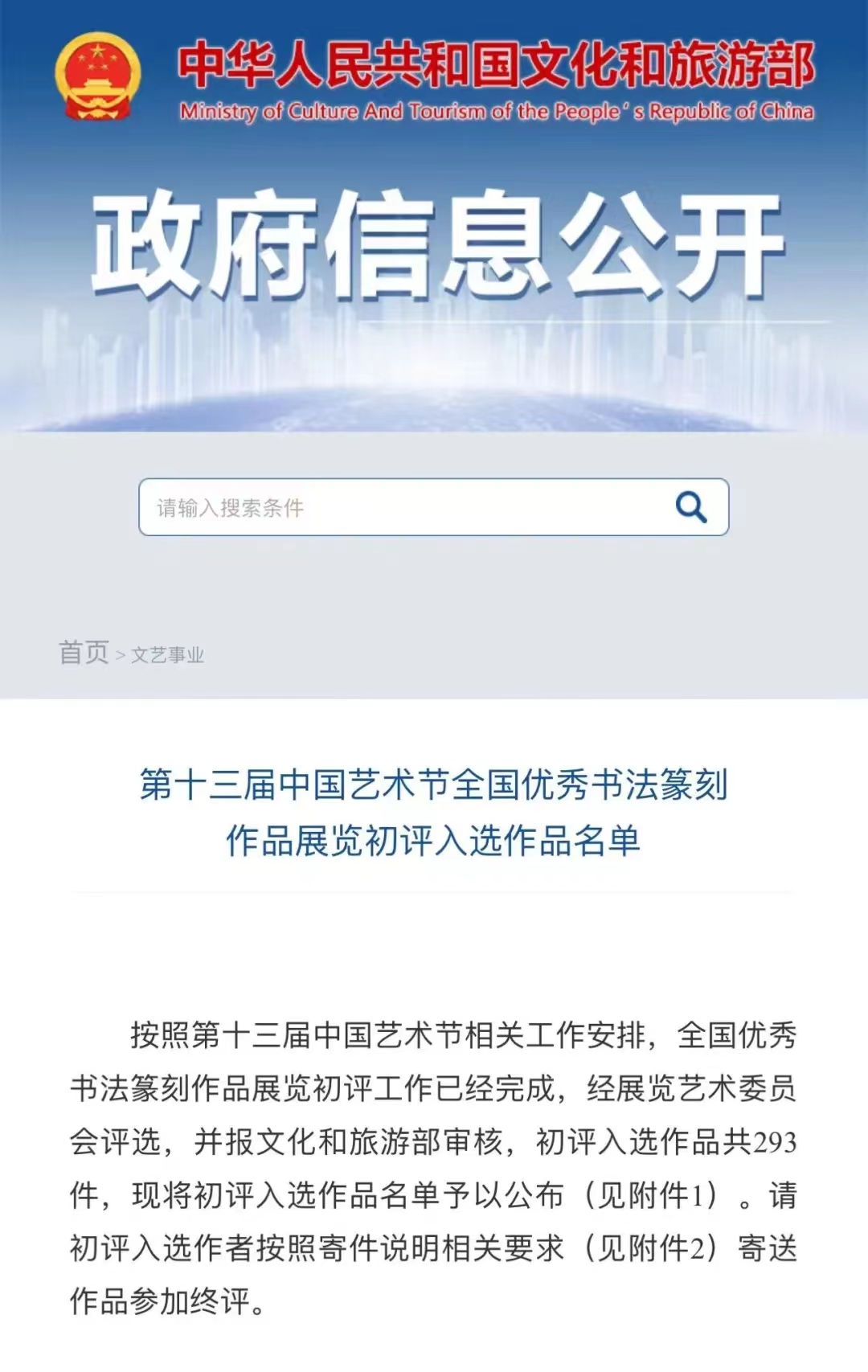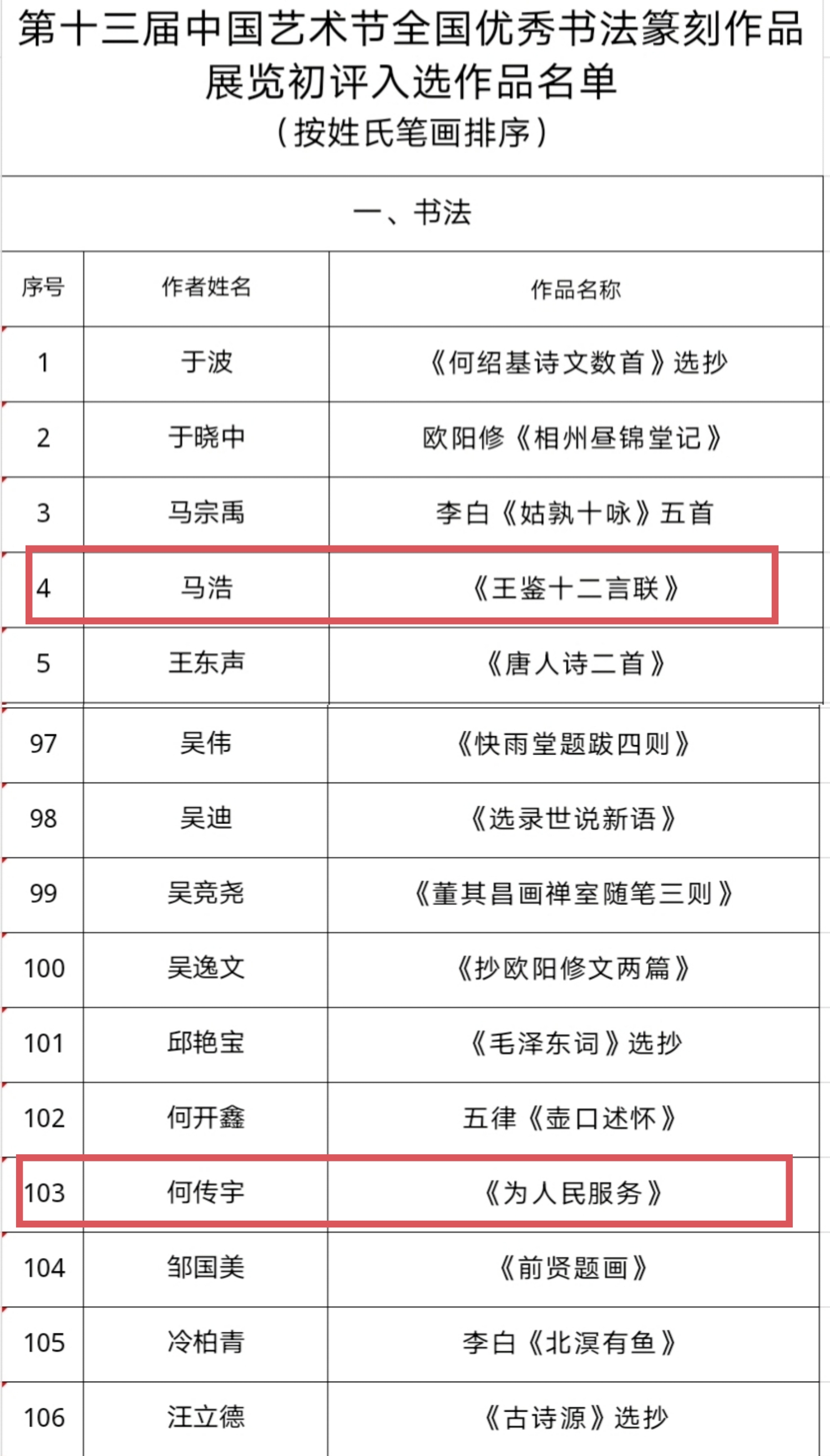 喜报:公司2件书法作品在第十三届中国艺术节全国优秀书法篆刻作品展览初评入选 作者:白依凡 来源:公海gh555000aa线路检测 发布时间:2022-07-26 阅读次数: 7月14日,中华人民共和国文化和旅游部公布了第十三届中国艺术节全国优秀书法篆刻作品展览初评入选作品名单,公司2021级研究生马浩书法作品《王鉴十二言联》,2019级本科生何传宇书法作品《为人民服务》入选。 马浩入选作品 何传宇入选作品 (审核 孔德滕)