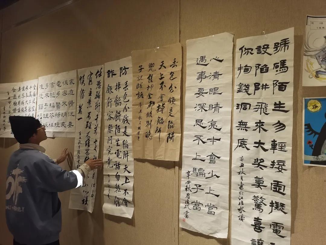 本次活动通过线下的方式展开。组织人员在活动前期对同学们进行书画征集,同学们都积极发挥自己的艺术才能,展开自己的想象,希望借自己的作品来提醒同学们不要轻信网络谣言,保护好个人财产安全。而在场的同学们都认真欣赏着参赛同学们的优秀作品,并且赞叹连连,一个个陈列在位的书画作品仿佛也在坚守着自己的使命,告诫人们不要相信网络上的虚假信息。即使活动结束后,同学们也在互相讨论着如何让更多的人去了解和避免受到诈骗。