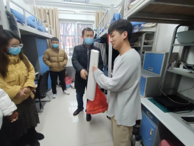为进一步宣传资助政策,慰问家庭经济困难员工,1月6日杨庆实书记带领辅导员到员工宿舍进行走访。