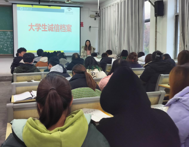 首先,王欣然向同学们说明诚信档案的重要性,随后就填写过程做详细的培训,带着同学们逐一进行指导填写,帮助同学们更加直观的了解填写过程及规范,并叮嘱同学们要认真听取要求填写,避免出错。其次,王欣然就同学们在学习生活中经常遇到的考勤情况、学业情况、助学贷款违约、等方面可能出现的失信现象进行重点强调,以避免出现失信行为。诚信档案填写完成后,由各班收齐进行保存。