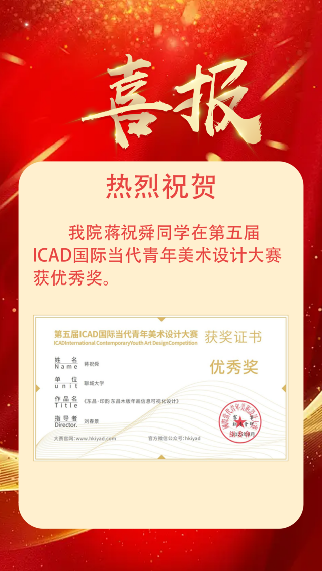 喜报|恭喜公司学子获得第五届ICAD国际当代青年美术设计大赛优秀奖 作者:么翠红 来源:公海gh555000aa线路检测 发布时间:2025-11-25 阅读次数: 恭喜蒋祝舜2025.08 第五届ICAD国际当代青年美术设计大赛优秀奖 (审核 孔德滕)