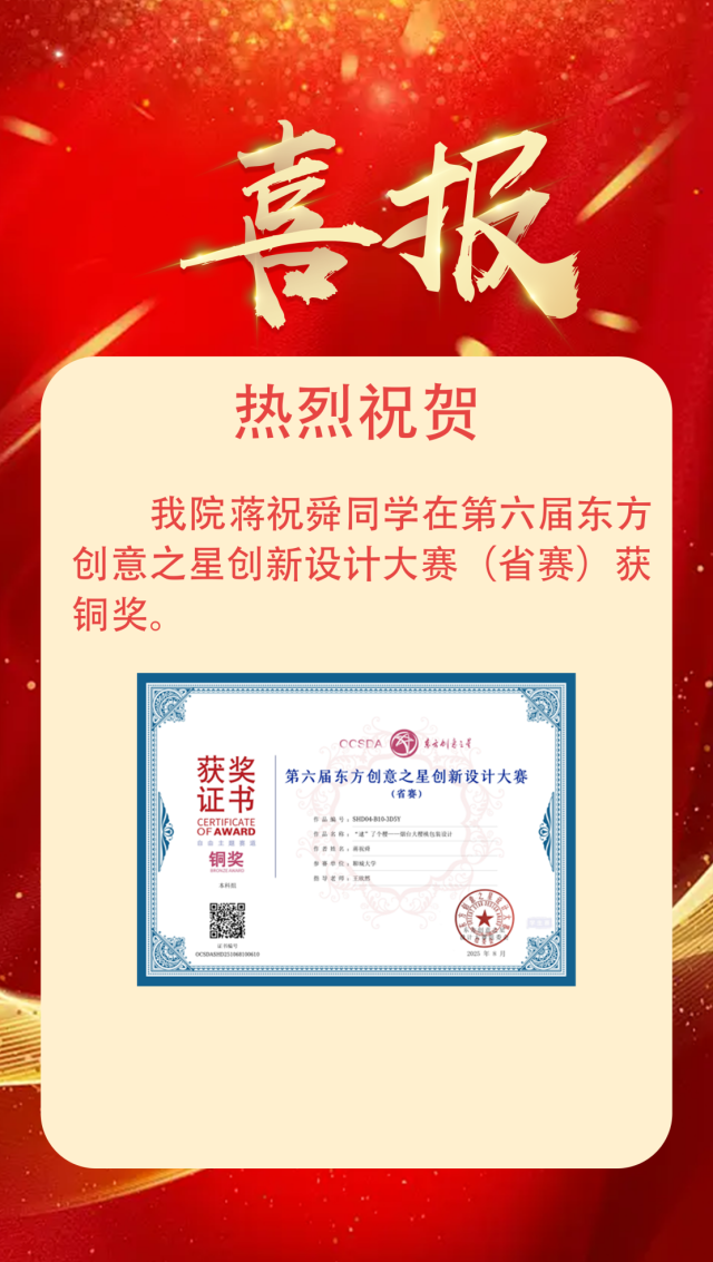 喜报|恭喜公司学子获得第六届东方创意之星创新设计大赛(省赛)铜奖 作者:么翠红 来源:公海gh555000aa线路检测 发布时间:2025-11-25 阅读次数: 恭喜蒋祝舜2025.08 第六届东方创意之星创新设计大赛(省赛)铜奖 (审核 孔德滕)
