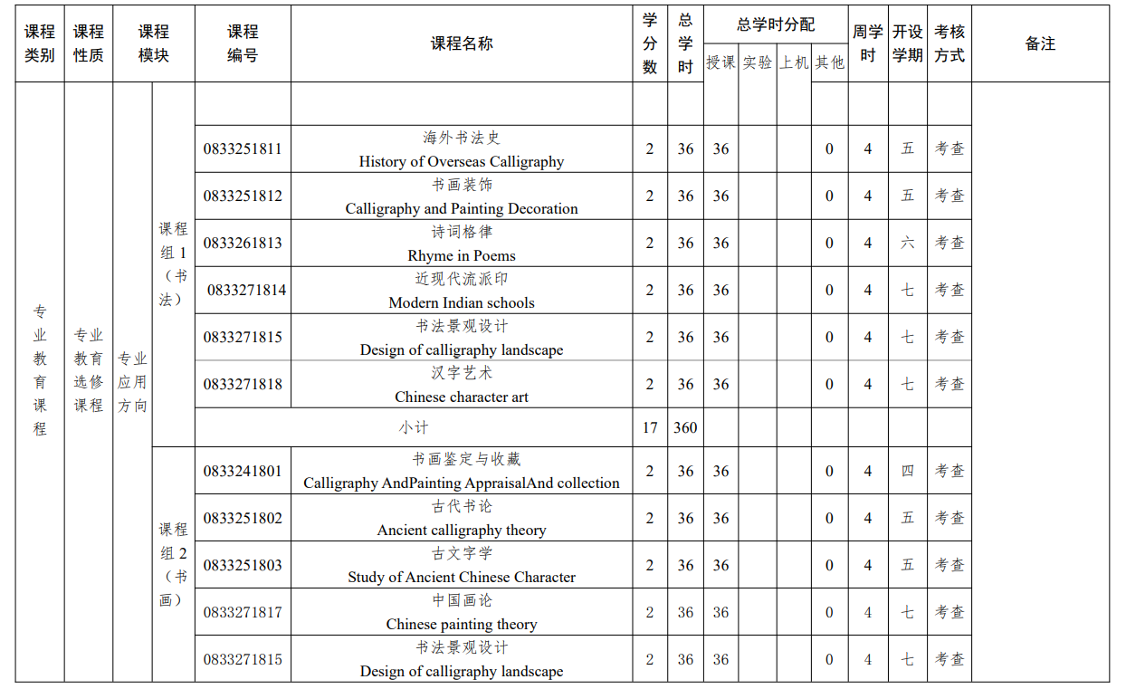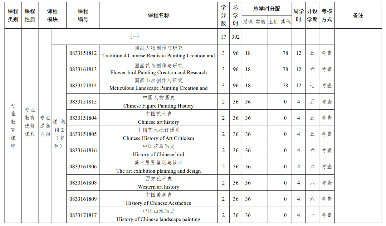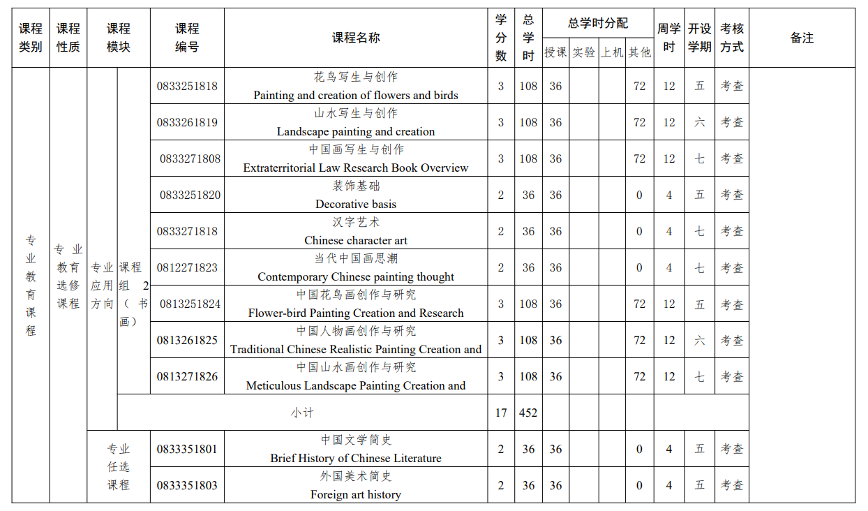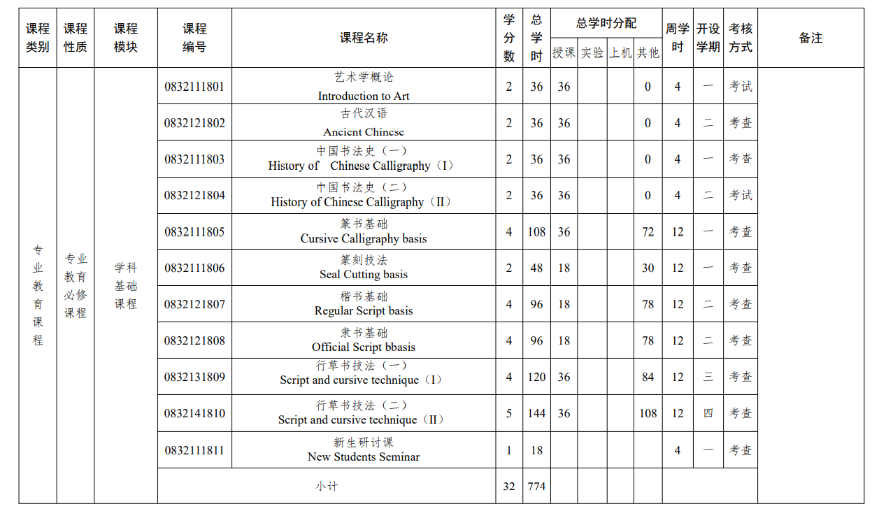 主要课程:篆书基础、楷书基础、隶书基础、行草书技法、篆刻技法、正书创作、行草书创作、 篆刻创作、中国书法史、古代书论、艺术概论、碑帖学导论、艺术美学、古文字学、中国篆刻史、 书法美学、文化遗产保护学、书画鉴定与收藏、中国美术简史、外国美术简史等。