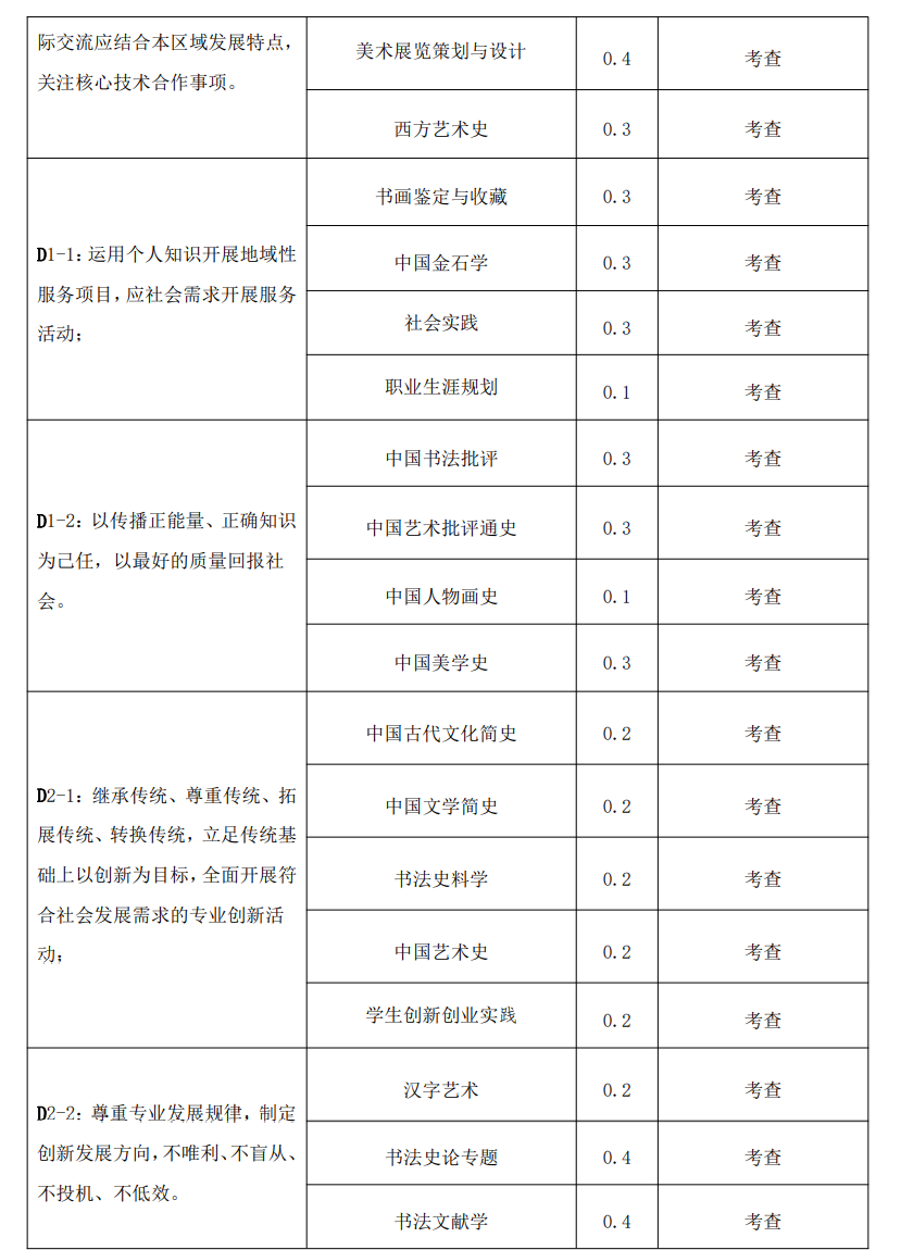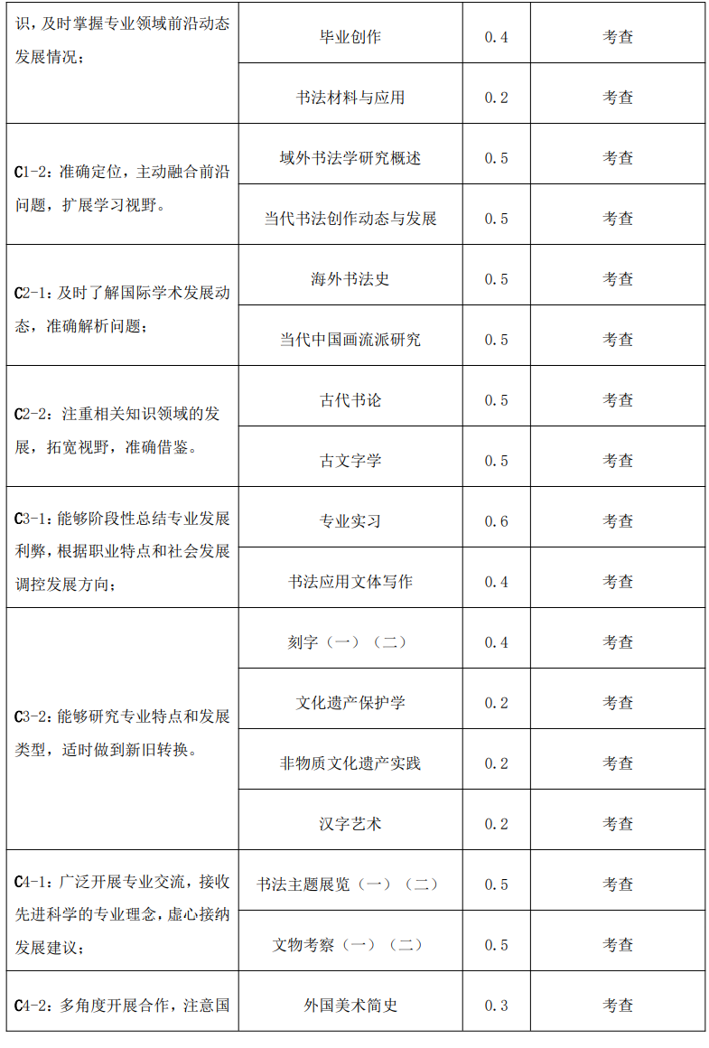 培养目标 2(职业能力):能综合运用书法学科知识和教学技能实现有效的书法活动;能引领 和组织团队进行集体活动,善于开发与利用资源。培养具备坚实的科学文化和艺术理论素养,具有 丰厚的中国传统文化滋养和卓越的前沿创新能力。