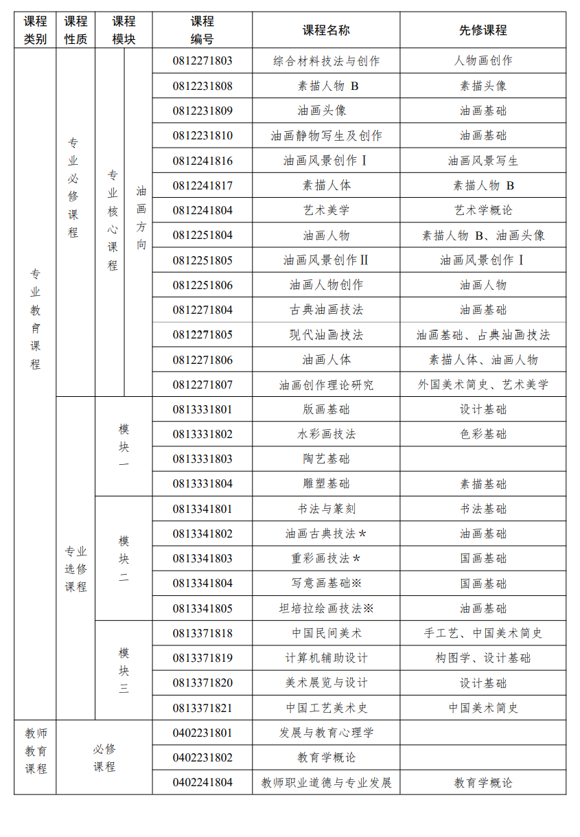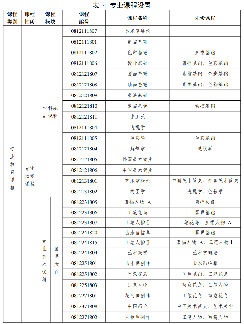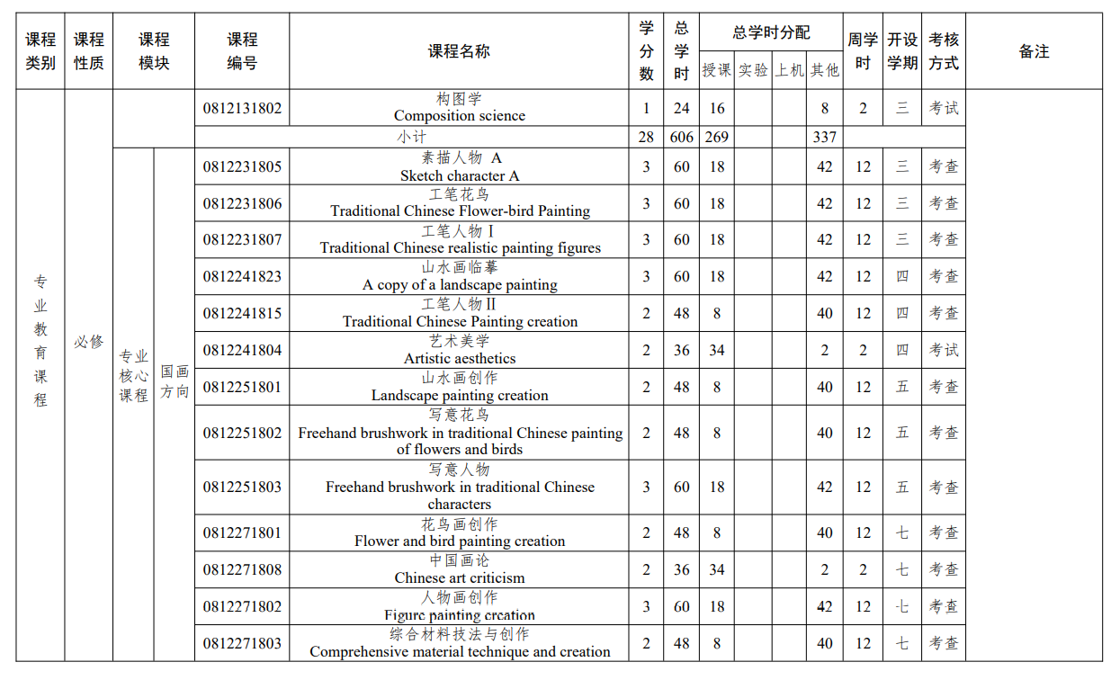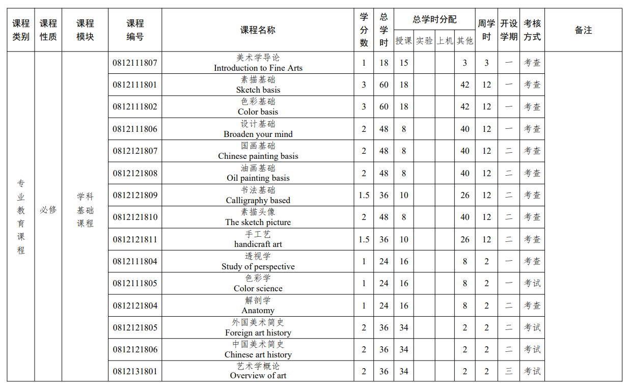 主要课程:素描基础、色彩基础、设计基础、国画基础、油画基础、书法基础、透视学、 色彩学、解剖学、中国美术简史、外国美术简史、构图学、中国画论、艺术学概论、艺术美 学、山水画写生与创作、工笔花鸟、工笔人物、工笔画创作、油画材料与技法、素描人物、 油画人物、写意花鸟、写意人物、人体写生、手工艺、综合材料技法与创作等。