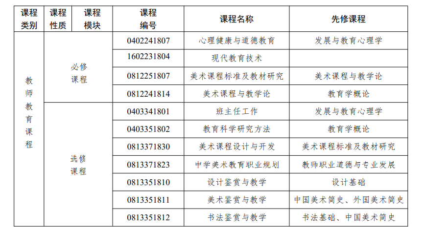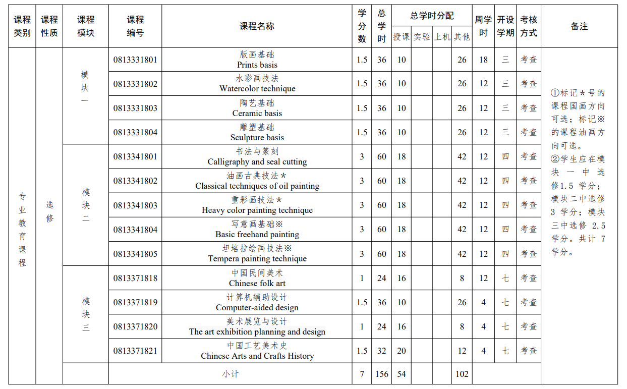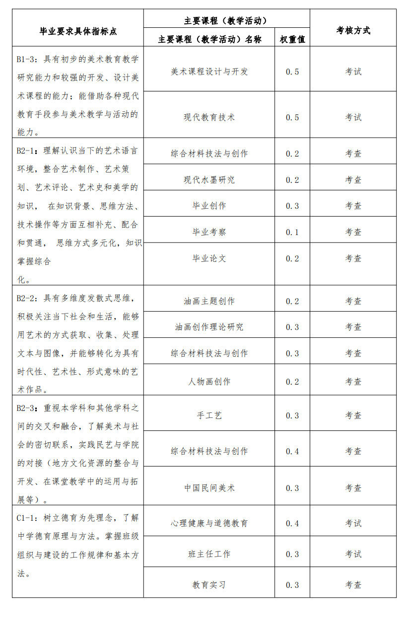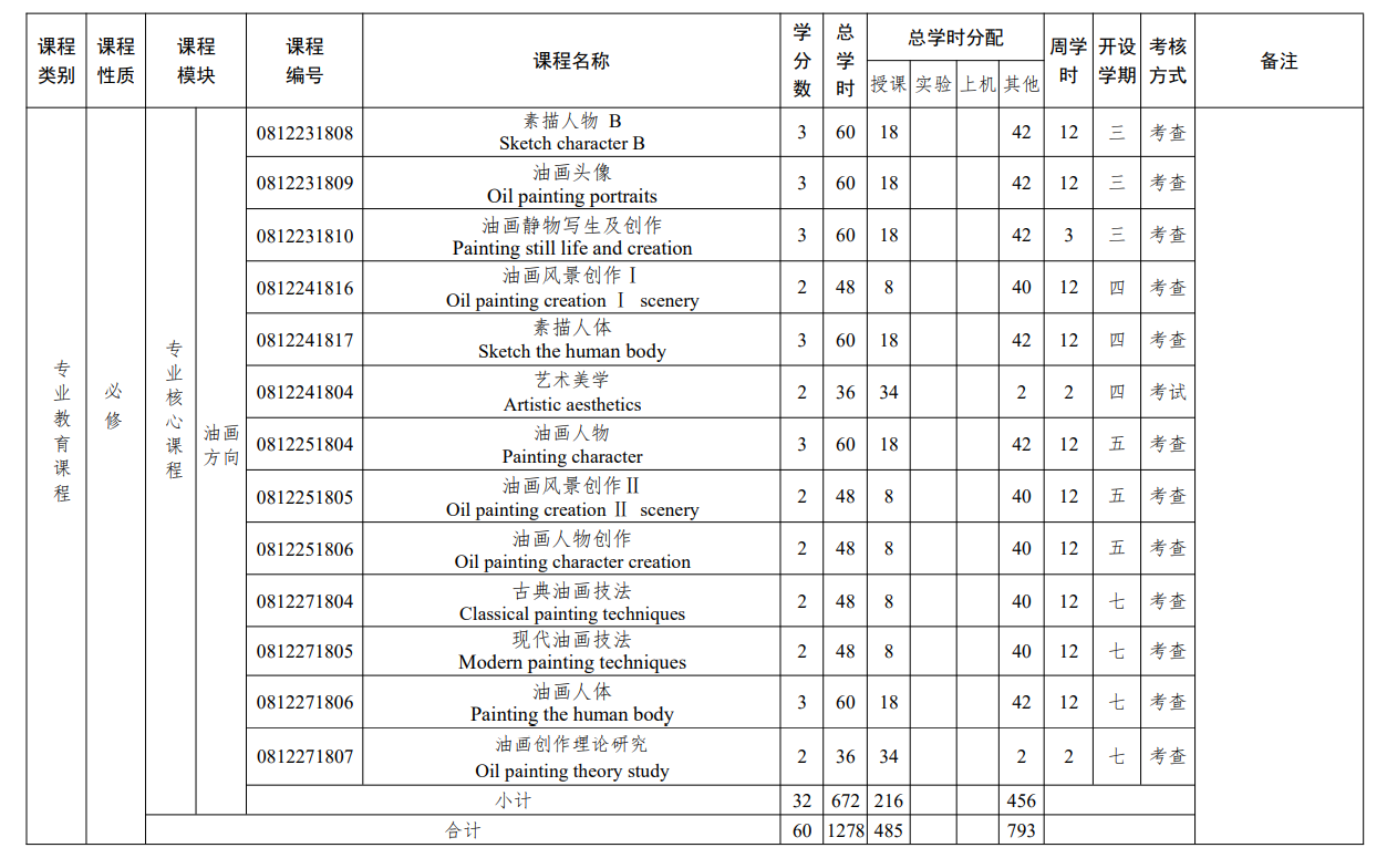主要课程:素描基础、色彩基础、设计基础、国画基础、油画基础、书法基础、透视学、 色彩学、解剖学、中国美术简史、外国美术简史、构图学、中国画论、艺术学概论、艺术美 学、山水画写生与创作、工笔花鸟、工笔人物、工笔画创作、油画材料与技法、素描人物、 油画人物、写意花鸟、写意人物、人体写生、手工艺、综合材料技法与创作等。
