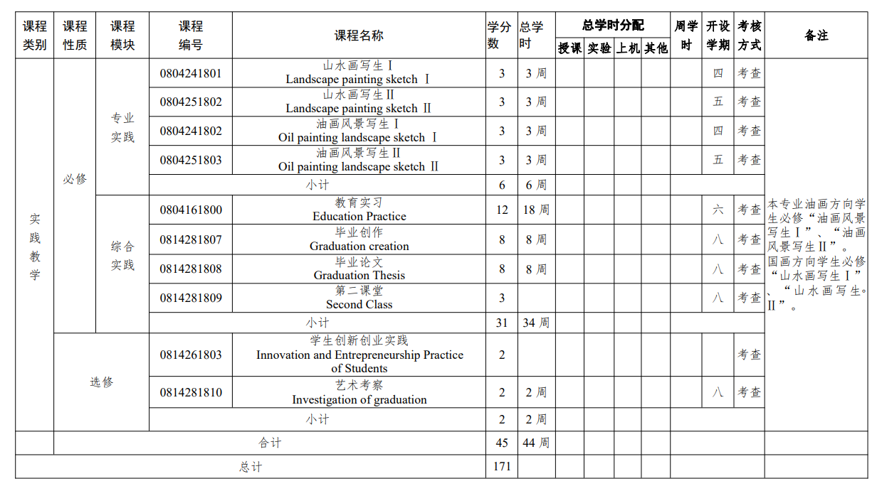 本专业主要实践性教学环节及主要专业实验包括风景写生、艺术考察、教育见习、教 育 实习、微格教学、毕业论文、毕业创作等。