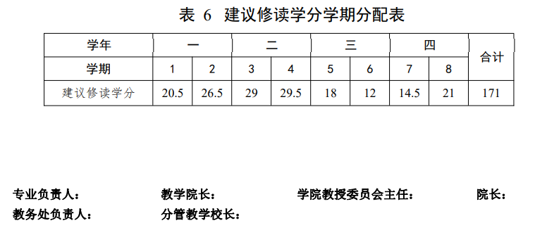 6.表 6 为本专业本科生建议修读学分学期分配表。