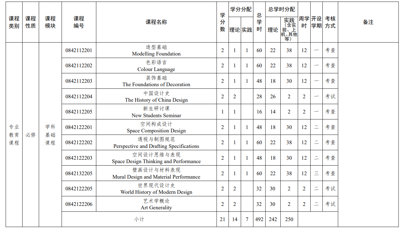 主要课程:造型基础、色彩语言、装饰基础、空间构成设计、透视与制图规范、空间设计思维 与表现、中国设计史、世界现代设计史、艺术学概论、建筑构造与设计、照明设计、装饰材料与施 工预算、设计心理学、人体工程学、中外建筑史、环境艺术概论、设计美学、家具与软装设计、公 共空间设计、展示空间设计、居住空间设计、室内设计原理、品牌策划与管理、景观设计原理、植 物景观设计等。