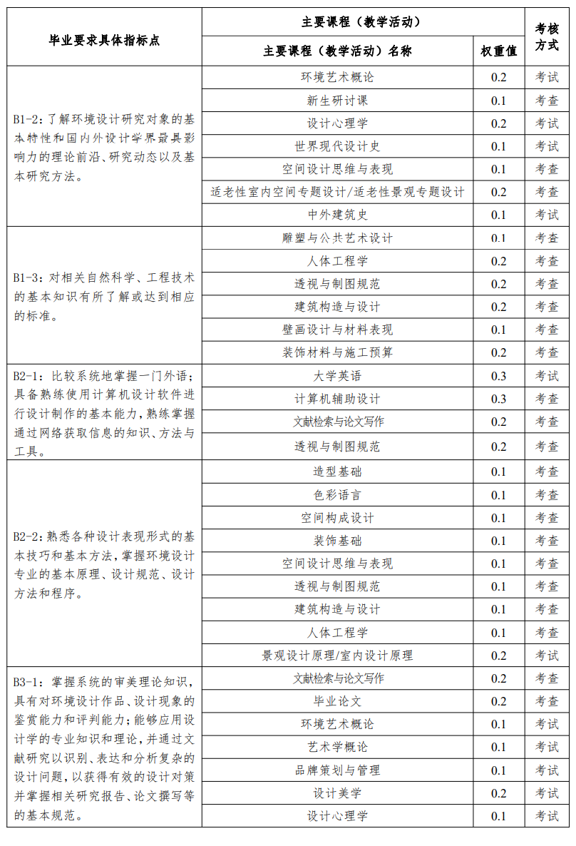 B3-3:具有综合运用所学专业理论和专业设计知识进行环境设计方案的调研、创意及执行的能力;具备常用施工工艺、装饰材料等方面的专业知识以及具有设计工程管理的能力。能够针对环境设计复杂问题提出解决方案,考虑经济、文化、环保、安全、技术、美观等因素,并能够在设计环 节中体现创新意识。