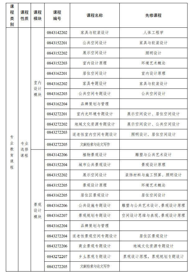 3.本专业本科生在专业教育选修课程中,需从室内设计方向和景观设计方向模块中选择一个完 整模块修读,需修满 39 学分。